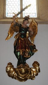Neben der Rokokokanzel ist der Erzengel Michael zu sehen.